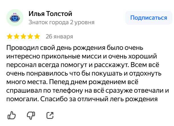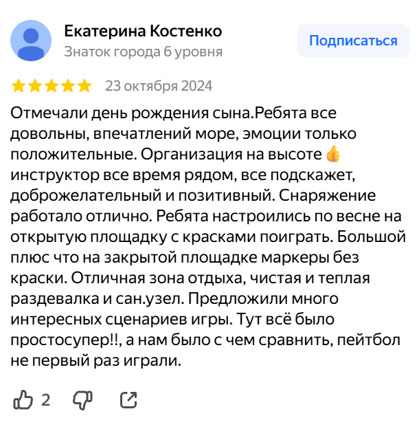 После игры всех ждут увлекательные развлечения, а при желании — аниматор или ведущий, который создаст отдельное приключение для маленьких героев.Каждый день рождения у нас — это не просто праздник, а мини-история, где каждый участник становится частью команды и получает эмоции, которые останутся и в памяти всех приглашённых и на фото.